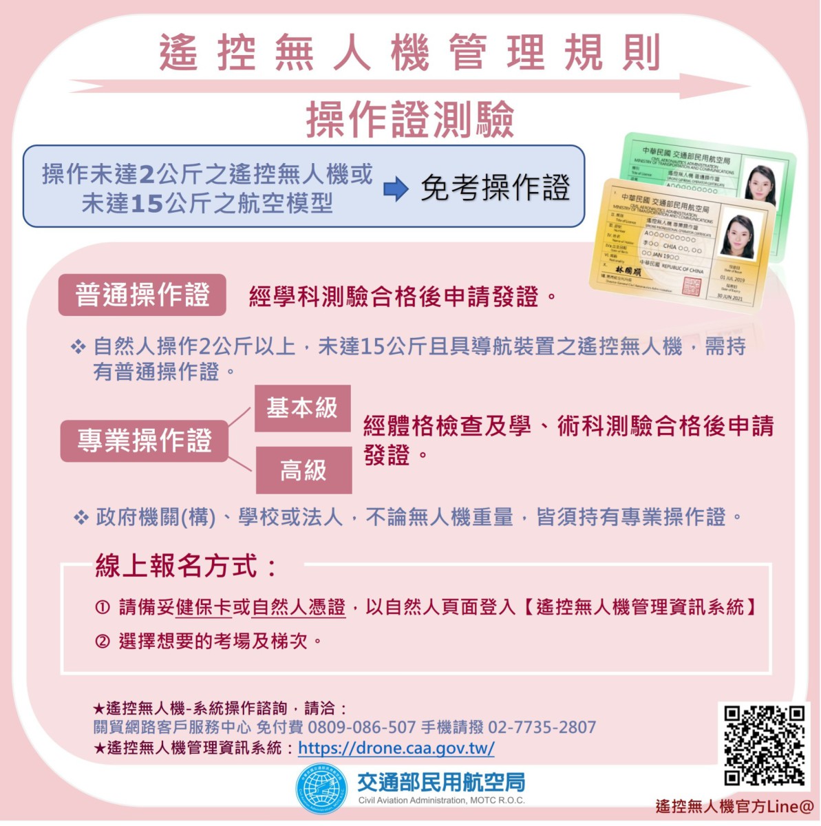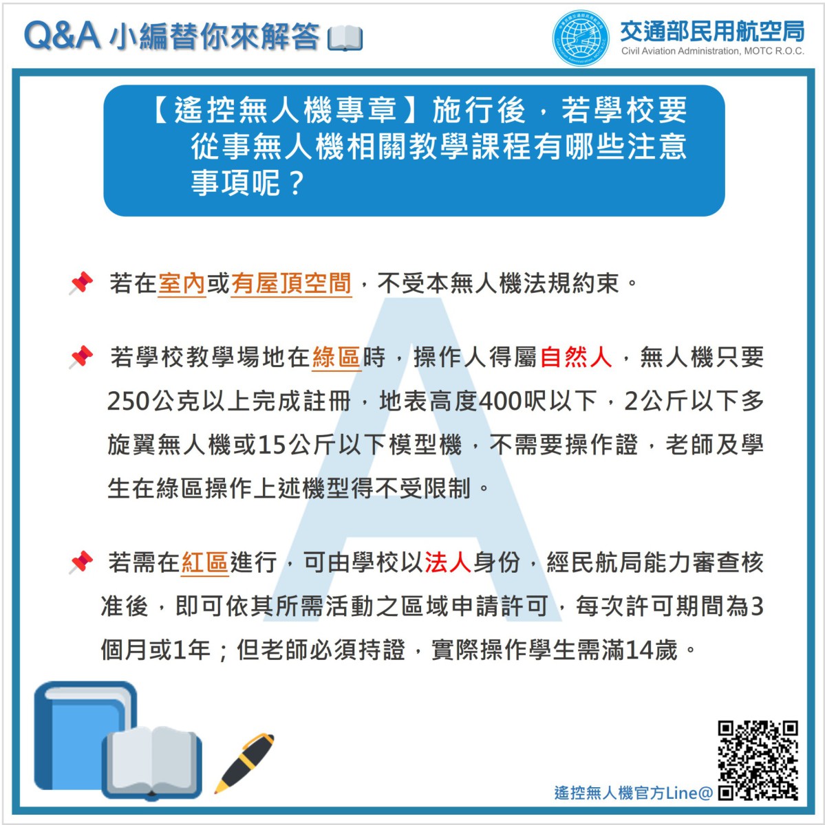 二、為避免師生因不諳民航法規及操作疏忽,致誤闖禁、限航區及機場四周等限制區域,而發生危及飛航安全之情事,該局已於官網設置「無人機專區」(網址:https://www.caa.gov.tw/article.aspx?a=188&lang=1)公告最新法規宣導內容,並另行製作無人機相關宣導資料供參(含註冊、操作證測驗、操作限制說明、機場四周及地方公告紅區禁止飛行、圖資宣導及學校教學注意事項),請貴校向教職員工生加強宣導,俾利共同維護飛航安全。