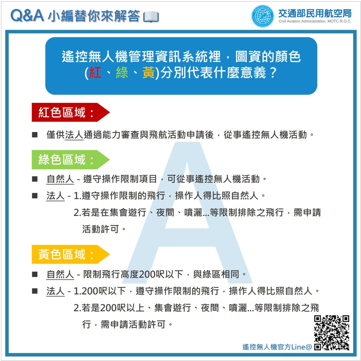 二、為避免師生因不諳民航法規及操作疏忽,致誤闖禁、限航區及機場四周等限制區域,而發生危及飛航安全之情事,該局已於官網設置「無人機專區」(網址:https://www.caa.gov.tw/article.aspx?a=188&lang=1)公告最新法規宣導內容,並另行製作無人機相關宣導資料供參(含註冊、操作證測驗、操作限制說明、機場四周及地方公告紅區禁止飛行、圖資宣導及學校教學注意事項),請貴校向教職員工生加強宣導,俾利共同維護飛航安全。