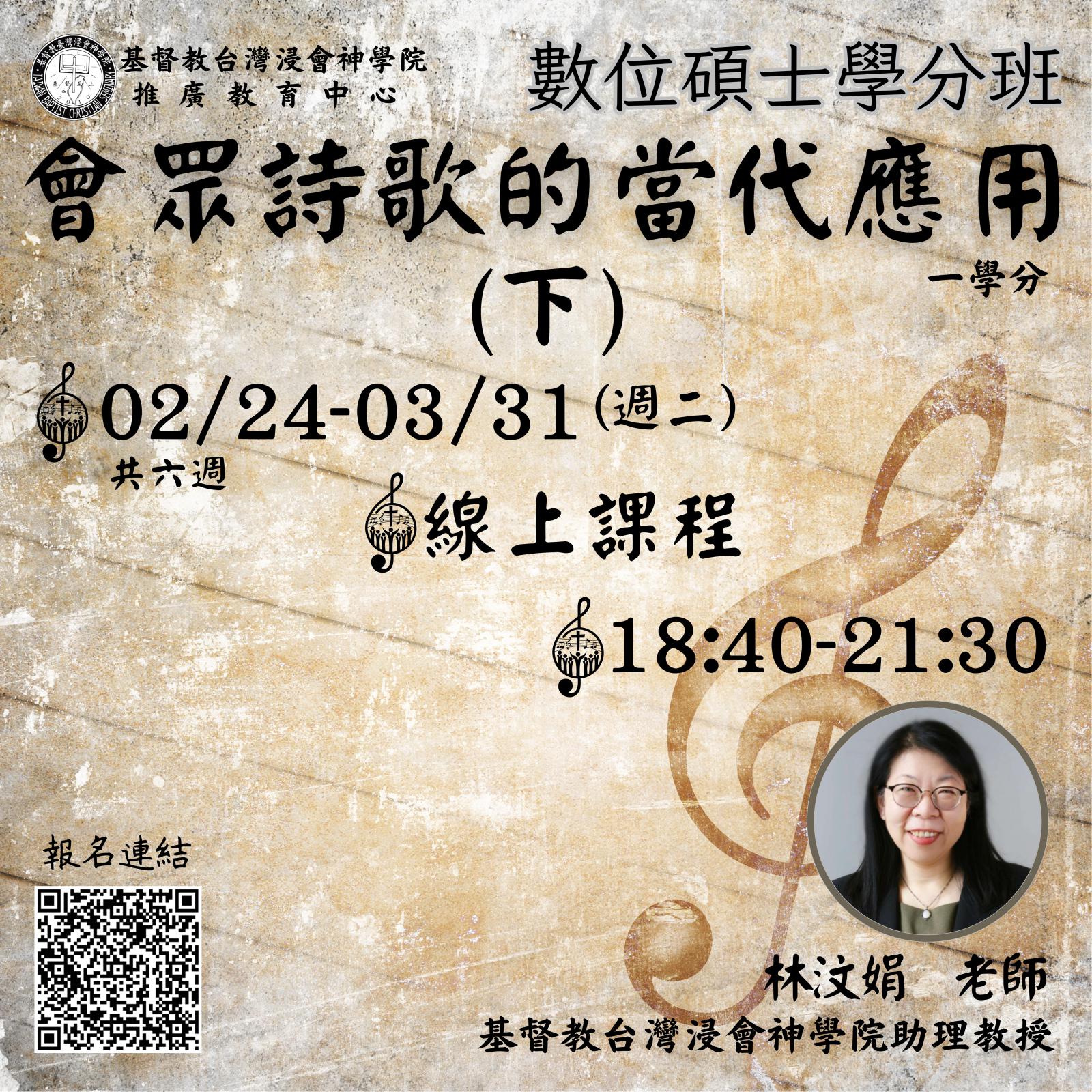 2.歡迎報名 ~114(下)數位碩士學分班【會眾詩歌的當代應用(下)】,即日起開始報名,敬請把握!New!!線上報名
