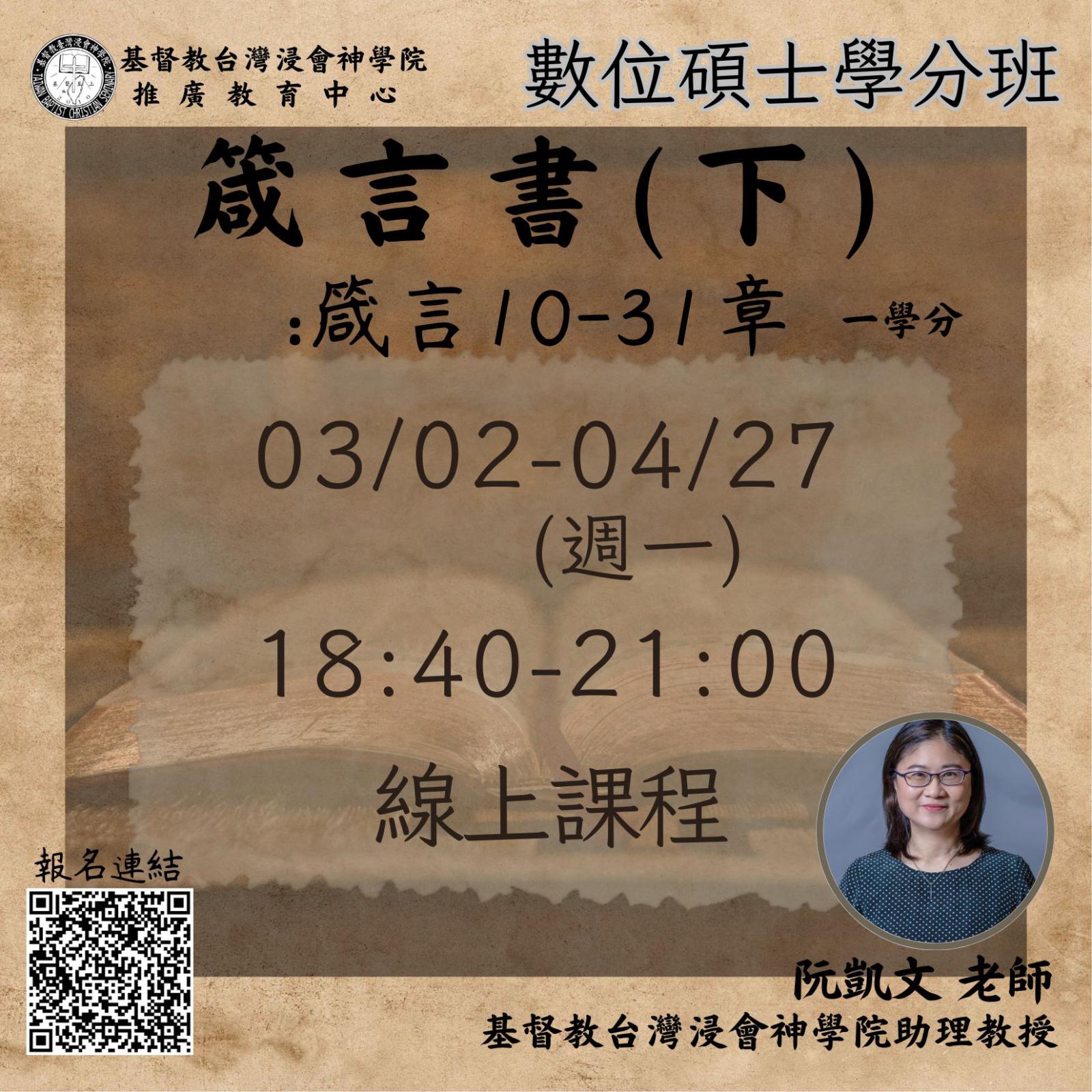 1.歡迎報名 ~114(下)數位碩士學分班【箴言(下):箴言10-31章】,即日起開始報名,敬請把握!New!!線上報名