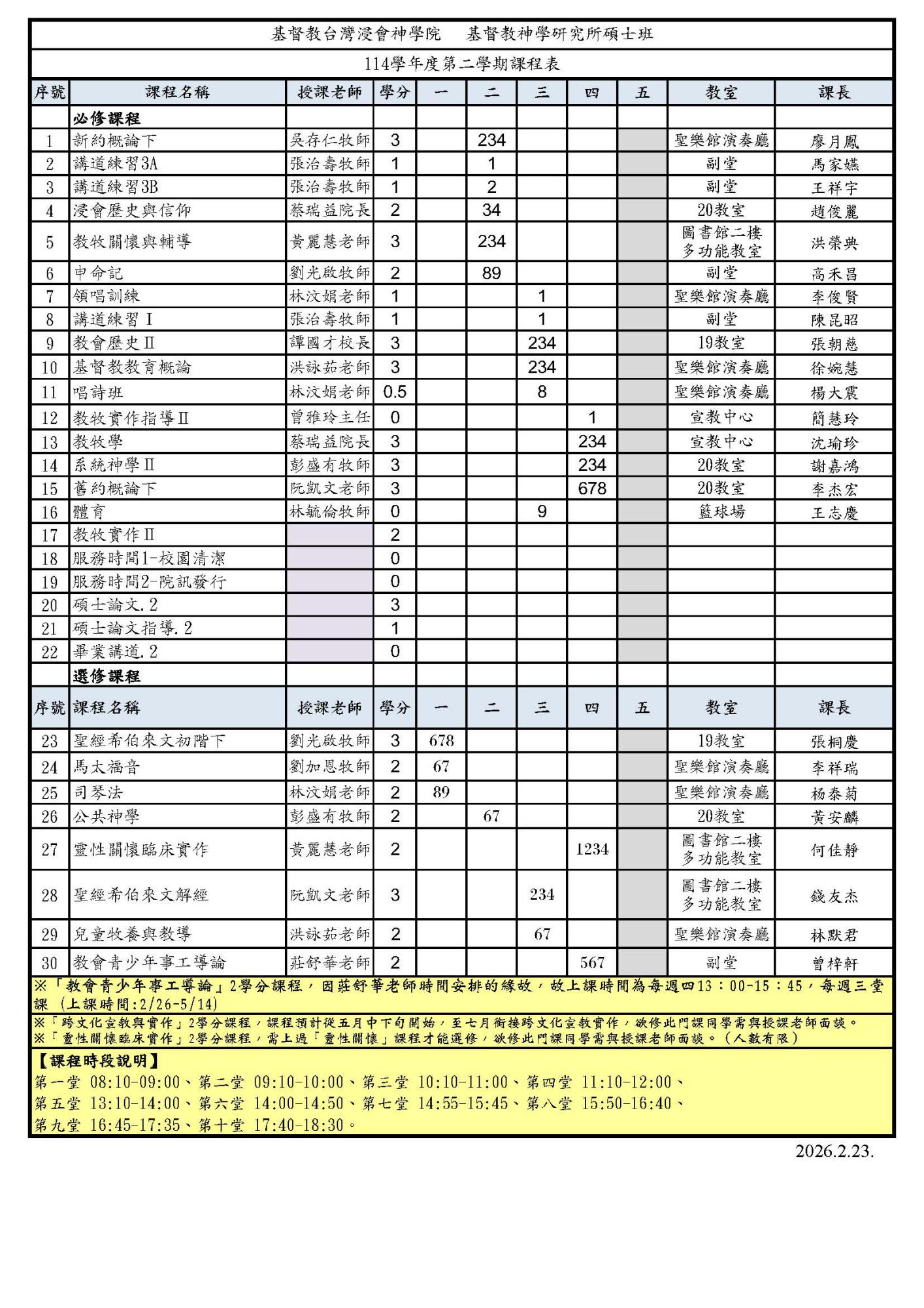 114學年度下學期課程表 - 基督教台灣浸會神學院